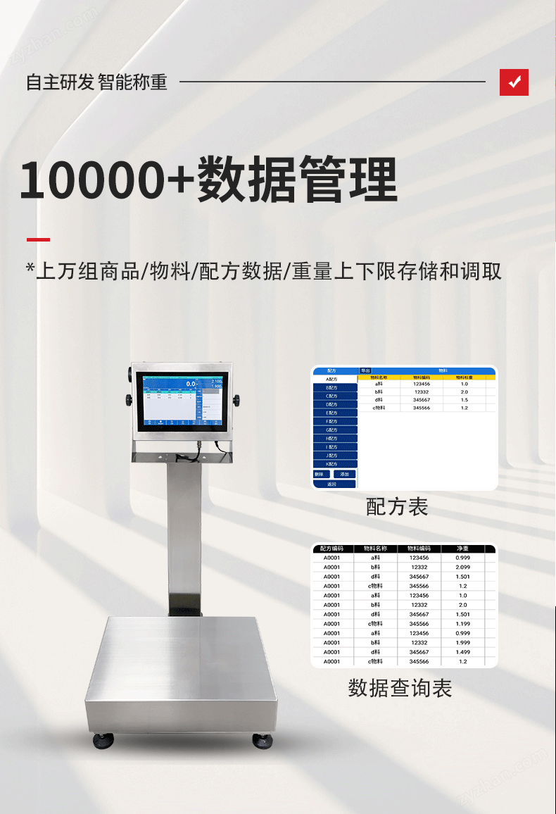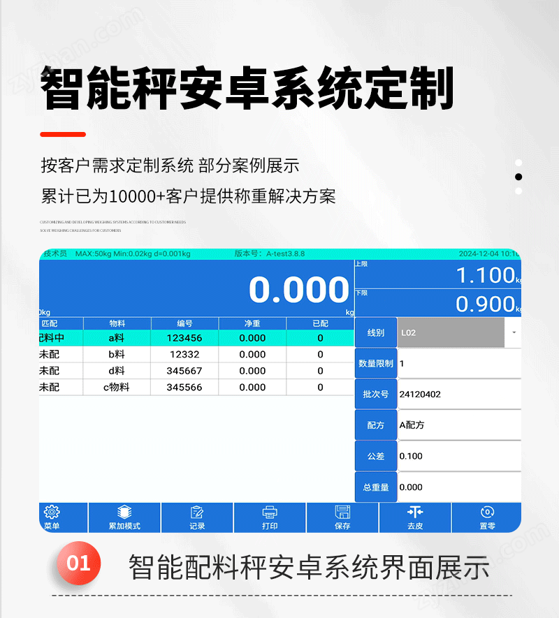 主要描述產(chǎn)品屬性,產(chǎn)品編號(hào)、品名、型號(hào)、上限值、下限值系統(tǒng)上可以自動(dòng)讀?。豢杀4嬲{(diào)用信息,并可以通過(guò)Excel 表格導(dǎo)入智能電子秤中;調(diào)用產(chǎn)品信息后過(guò)磅重可手動(dòng)、加載自動(dòng)、卸載自動(dòng)保存稱重?cái)?shù)據(jù)到電子秤上,可導(dǎo)出稱重?cái)?shù)據(jù)至電腦Excel 表格上:序列號(hào)、產(chǎn)品編號(hào),產(chǎn)品名稱、8個(gè)ID變量、數(shù)量日期,時(shí)間,重量,上限,合格,下限,判定結(jié)果,管理員等信息。以便查詢產(chǎn)品信息追溯使用。