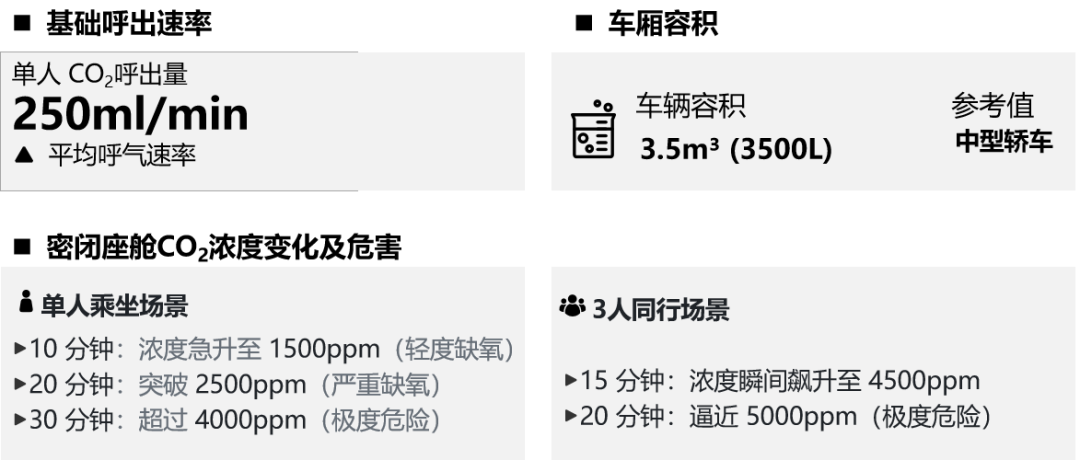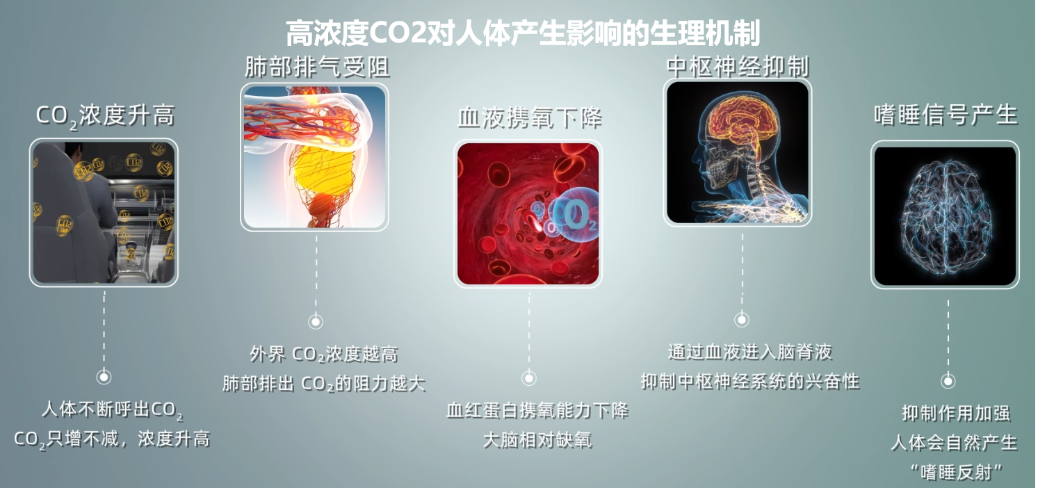 汽車座艙空間有限,人體呼吸會持續(xù)消耗O2、呼出CO2。在車窗緊閉、內(nèi)循環(huán)開啟的密閉座艙環(huán)境,新鮮空氣無法及時補(bǔ)充,導(dǎo)致CO2濃度短時間內(nèi)快速攀升,超過安全閾值,不僅影響司乘人員的健康,嚴(yán)重還會引發(fā)疲勞駕駛引發(fā)交通事故。更多內(nèi)容詳見《車內(nèi)缺氧隱患:被忽視的二氧化碳濃度監(jiān)測》